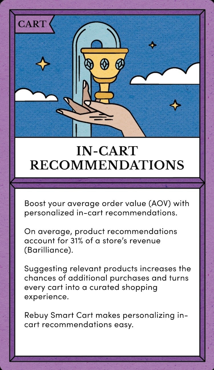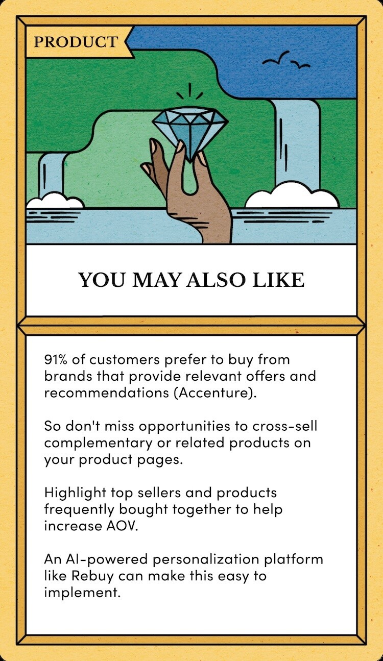 It's time to elevate your ecommerce store with 50 revenue-boosting strategies printed in beautiful full color on heavy-weight 350 gsm card stock. The Rebuy Ecommerce Tactics Deck will be your trusty companion as you grow your online brand.